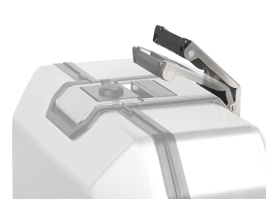 Unikátní integrovaný mechanismus zámku a madla umožňuje jednoduché ovládání jednou rukou a snadnou demontáž z motocyklu.