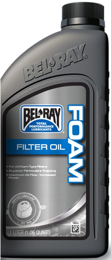 Bel-Ray Foam Filter Oil je olej pro pěnové vzduchové filtry určený pro všechny silniční, off-roadové i závodní aplikace s pěnovými filtry. Inovativní technologie Bel-Ray vytvořila olej na pěnové filtry, který se liší od běžných produktů. Snadno se aplikuje a zlepšuje průtok vzduchu. Ultra viskózní formule vytváří olejovou bariéru, která zachytává mikroskopické částice schopné poškodit motor. Voděodolný olej Bel-Ray navíc zabraňuje ucpávání filtru při kontaktu s vodou.
