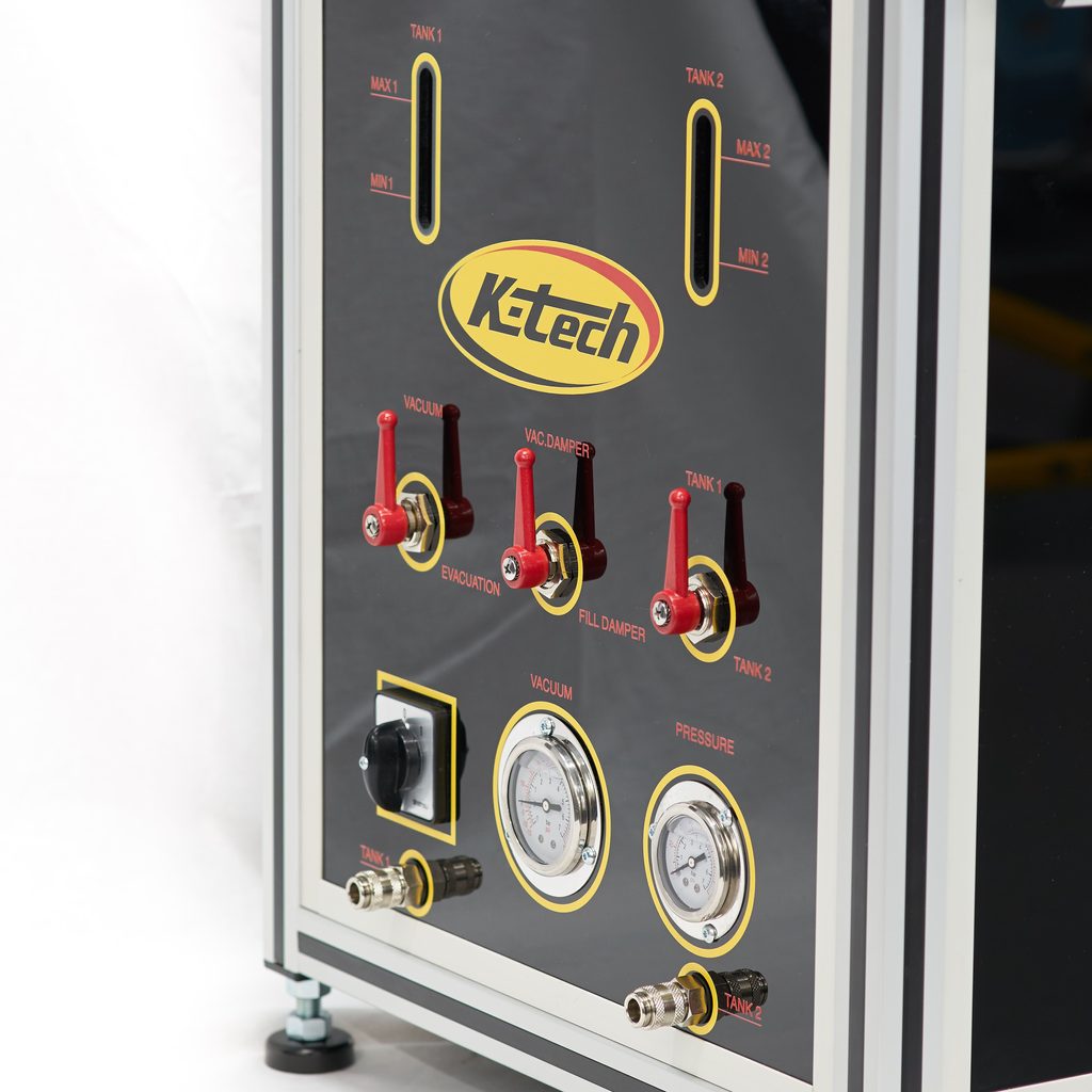 Vakuová plnící pumpa K-tech je spolehlivým nástrojem pro naplnění jakéhokoli tlumičového systému. S objemem 9 kubických metrů za hodinu zaručuje kratší čas plnění. Má dvě pětilitrové olejové nádrže, pro skladování různých typů oleje.