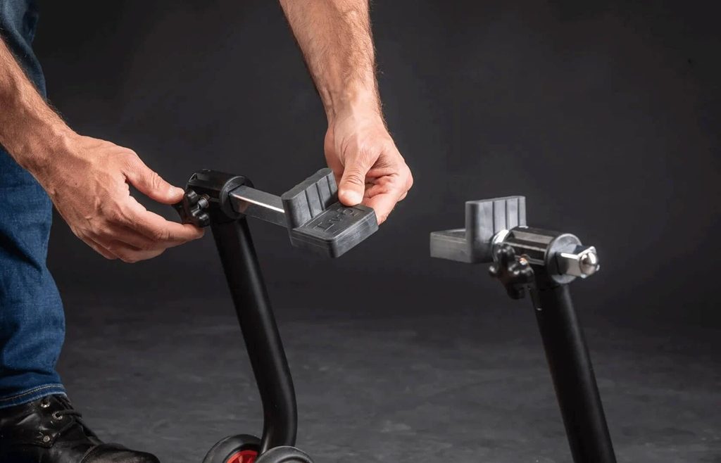 Patentovaný zadní stojan na motorku dodávaný ve třech snadno montovatelných dílech - lze ho sestavit bez použití šroubů a šroubováků.