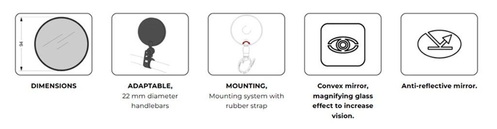 Kromě své funkce na silnici poskytuje zrcátko jasný výhled, což přispívá k bezpečnější jízdě. Jeho lehká konstrukce orientovaná na off-road zajišťuje vynikající odolnost a optimální výdrž i v náročných podmínkách.